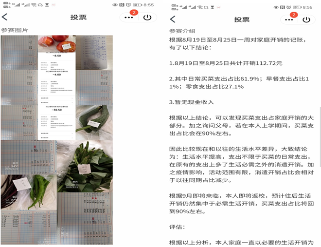 本次活动旨在鼓励老员工形成正确的理财和消费观,并将专业知识应用于生活实践,将理论知识与实际操作结合,在巩固所学的同时培养同学们知行合一的良好品质。家庭是经营的一个小单位,模拟经营过程中虽然没有主营业务和其他业务的分类,也没有三大期间费用和制造费用的复杂,交易性金融资产更是少见,但柴米油盐酱醋茶的细枝末节和水电房租费用的分摊,以及出行交通费、通讯电话费等的处理对专业知识也有一定的要求。活动在同学之间产生了巨大反响,历时两周共收到了70份参赛作品,作品记录了同学们记账及形成报表的全过程以及一周模拟经营的感触和对自身专业更深一层的理解。作品评选阶段,为保证公平公正和公开透明,主办方成立了评审小组,小组制定了统一的评分标准和严格的运行规则,以“一切为选出优秀作品”为原则进行评审。最终,通过评审小组评选和参赛选手互评,按照7:3的评分比例,评选出了10份优秀作品。