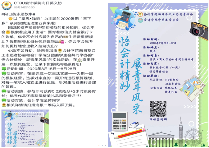 2020年8月15日,bb贝博艾弗森官方网站启动了2020暑期“三下乡“活动的第四个子活动——"悟会计精妙,展青年风采"模拟经营大赛。此次活动围绕“决胜全面小康”、“建党九十九周年”等主题开展,同学们在家完成一次专业实践—为期一周的家庭模拟经营。参赛者对家庭一周的开销进行预算规划、对每一笔收入和支出的原始凭证进行收集、整理和记录,同时更加合理的管理日常生活费,在模拟经营的过程中,充分利用专业知识,体会会计的精妙之处。
