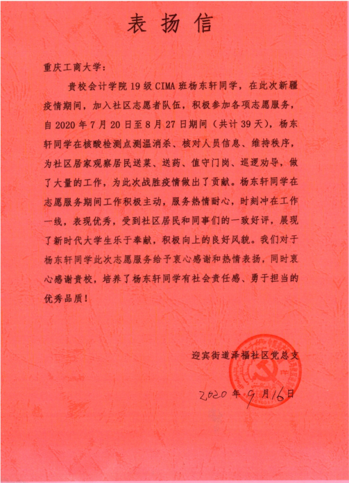 杨东轩返校后,并没有向同学老师提及他的志愿者经历,直到泽福社区党总支向学院寄来了感谢信……