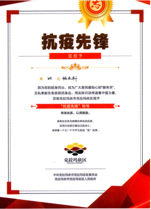 2019级CIMA班,来自新疆克拉玛依的杨东轩同学就是其中的一员。在此次新疆疫情期间,他加入了志愿者队伍。自2020年7月20日至8月27日,杨东轩积极参加各项志愿者服务:核酸检测点测温消杀、核对人员信息、维持秩序、为社区居家观察户送菜、值守门岗、巡逻劝导……他不辞辛苦,为抗疫做出了自己的贡献。