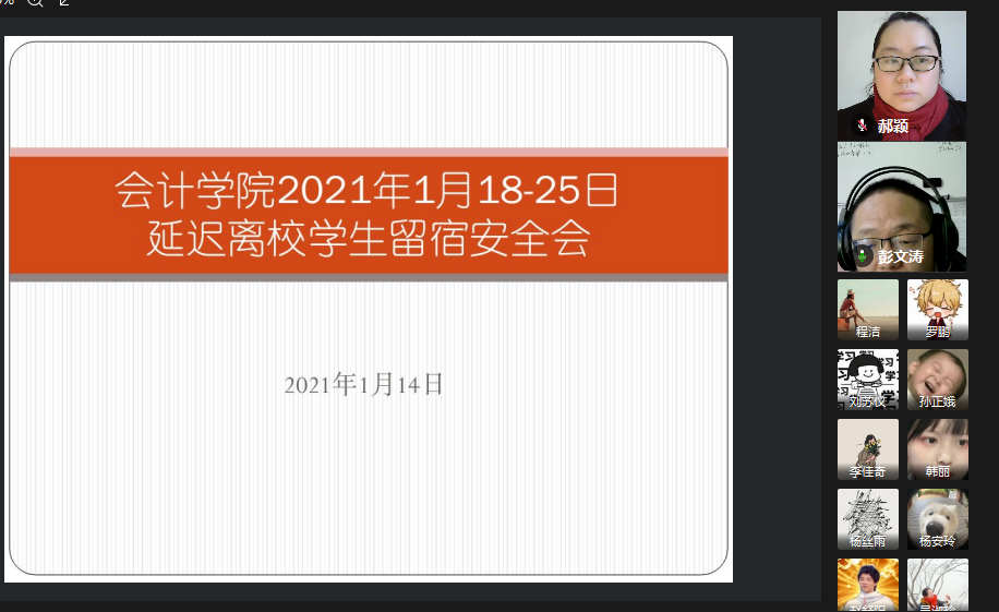 为加强寒假延期离校员工在校住宿期间安全管理,2021年1月14日,bb贝博艾弗森官方网站员工工作领导小组通过企业微信线上视频会议开展了寒假延期离校员工留宿安全会。会议由学院学团办主任彭文涛主持,学院郝颖副书记及相关辅导员、49名延期离校本科生参加了本次会议。