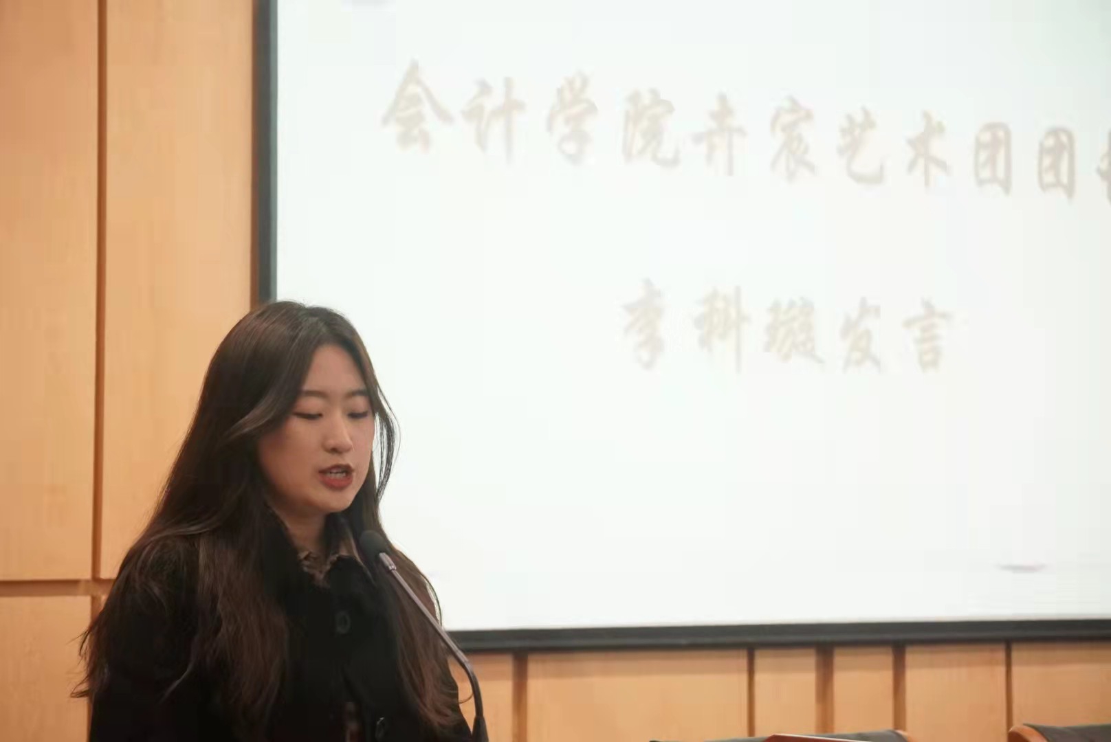 会议伊始,由郝颖副书记致辞。首先,郝颖副书记代表学院祝贺艺术团的成立。随后,她就艺术团未来发展提出了: “精准定位,明确职责”,“严于律己,积极排练”以及“努力学习,全面发展”,并预祝艺术团会越办越好。