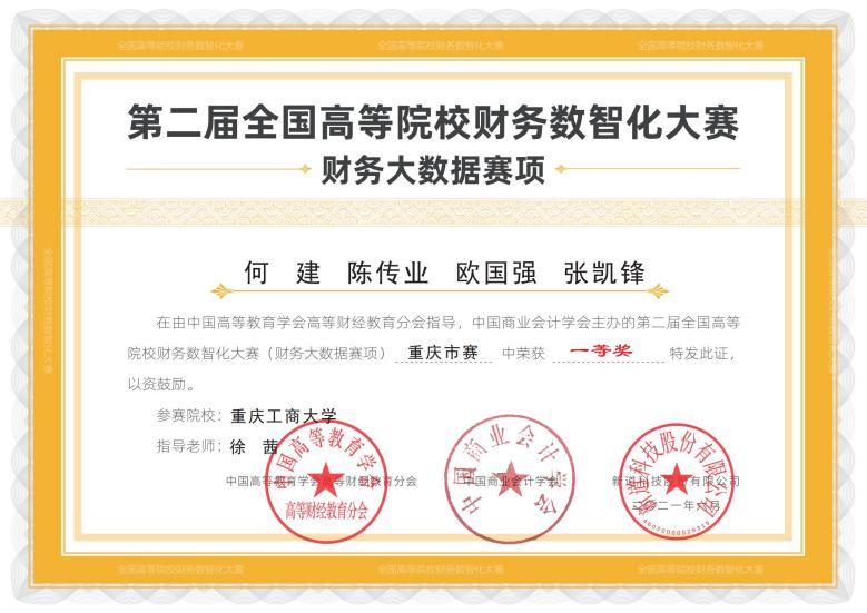 在bb贝博艾弗森官方网站各级领导大力支持下,bb贝博艾弗森官方网站徐茜老师、李芃老师、幸素园老师、高年级同学和毕业员工的悉心指导帮助下,经过不断探索、努力拼搏、团结奋进,bb贝博艾弗森官方网站2019级19会计一班欧国强、何建、陈传业、张凯锋4名同学,19智能会计刘睿、刘子铭、曹刚、王思苏4名同学,共2支队伍组成的本科生代表队在10月17日重庆市第二届全国高等院校财务数智化大赛(财务大数据赛项)市赛中分别荣获重庆市一等奖、二等奖。其中由徐茜老师、李芃老师指导的19会计一班欧国强、何建、陈传业、张凯锋4名同学组成的队伍,代表重庆市参加第二届全国高等院校财务数智化大赛(财务大数据赛项)全国决赛,公司代表队同西南财经大学、天津财经大赛、兰州大学等近60支本科生代表队同台竞技,经过理论考试、企业案例分析、线上答辩等环节,11月27日最终荣获第二届全国高等院校财务数智化大赛(财务大数据赛项)全国三等奖。