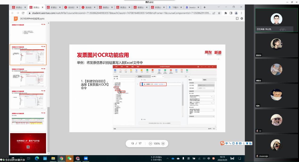 第七期教学工作坊以机器人流程自动化(RPA)为主题,主要向大家讲解如何运用RPA的相关技术进行数据的读入、取出、循环。会议开始,李志良老师首先向大家介绍了OCR的内涵,并说明OCR的主要步骤分为图像处理以及文字识别。接着,李志良老师向同学们亲手示范如何运用OCR技术对发票进行识别,使同学们对于OCR在财务上的具体应用有了更加清晰直观的认识。