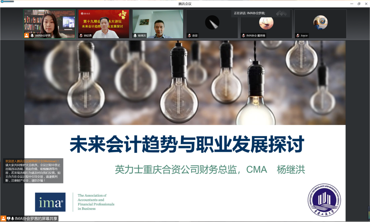 6月1日下午,bb贝博艾弗森官方网站第十九期会计实务大讲坛以在线会议形式顺利举行。英力士重庆合资公司财务总监杨继洪先生应邀为bb贝博艾弗森官方网站研究生作了《未来会计趋势与职业发展探讨》的专题讲座,bb贝博艾弗森官方网站副经理钟廷勇教授及bb贝博艾弗森官方网站部分研究生参加了本次讲座。讲座由IMA协会罗茜女士主持。