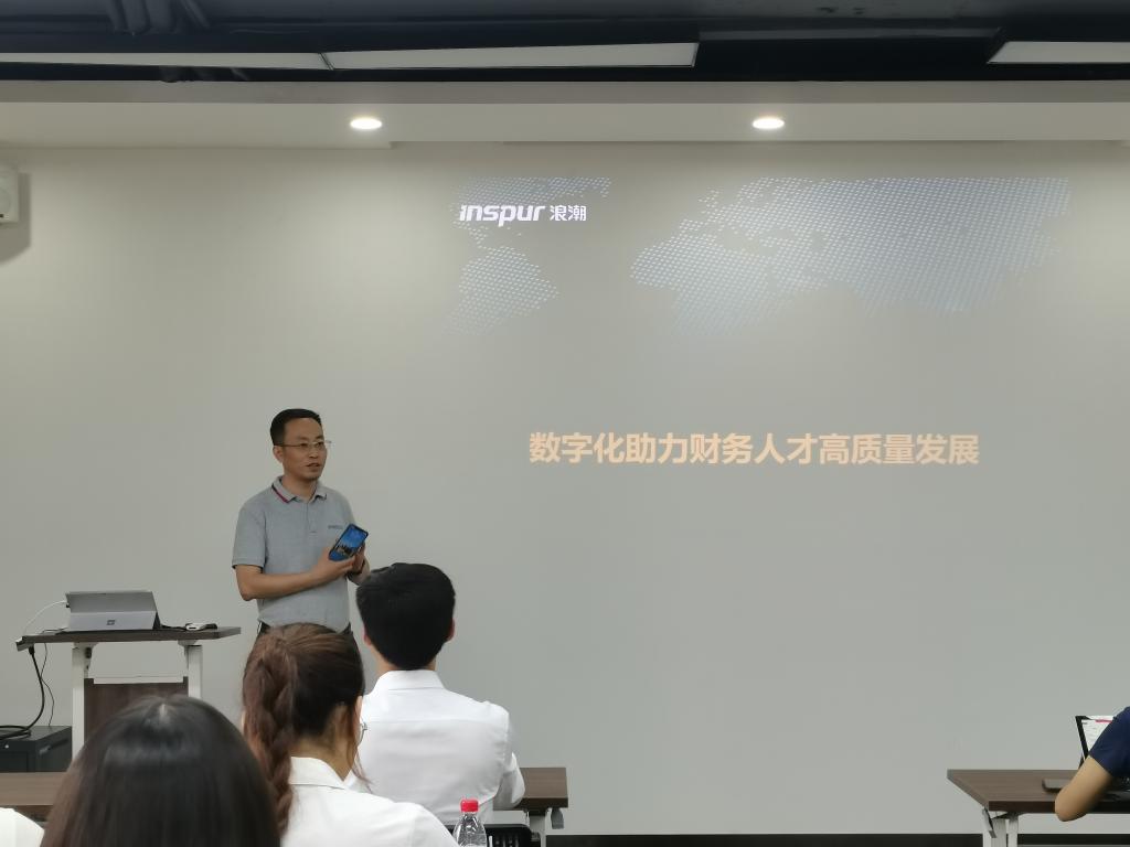 展厅参观结束后,浪潮国际重庆区总经理王宏波在会议厅为员工们讲授了题为“数字化助力财务人才高质量发展”的专题课程,同时还为老师和员工们准备了丰厚礼品。王宏波指出,德雷福斯模型为我们揭示了职业发展的方向与目标,紧跟时代步伐则是关键。他强调,新管理会计、新平台、新生态和新核算组成“四新一体”架构,引领着财务数字化转型的新风向。