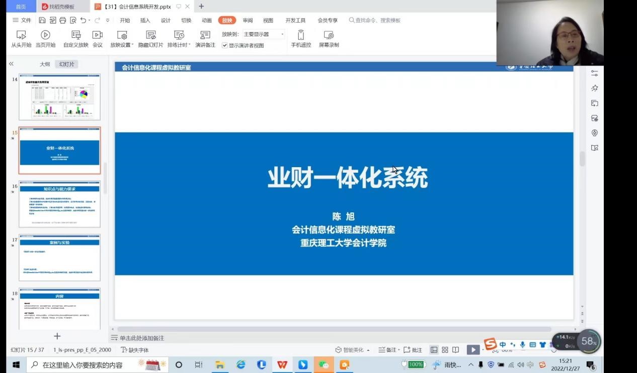 2022年12月27日下午,由教育部会计信息化课程虚拟教研室、重庆市成渝数智会计虚拟教研室、重庆市会计信息化教学名师工作室联合主办的智能会计教学工作坊(第二十九期)在钉钉APP线上直播如期举行。此次教学工作坊邀请到了重庆理工大学的陈旭、唐蕾、杨玉涵、倪红为同学们讲授《会计业务数据分析》课程。学院2022级会计专硕全体员工参加了此次教学工作坊。