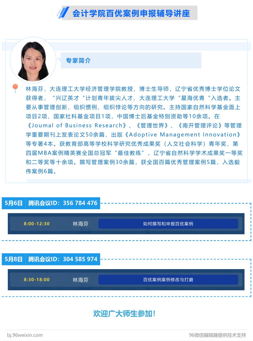 为提升教师和员工案例开发与研究的能力,进一步提高学院案例写作质量,bb贝博艾弗森官方网站邀请了大连理工大学经济管理学院林海芬教授为全院教师和研究生进行百优案例的申报与修改辅导。本次讲座分为“如何撰写和申报百优案例”(5月6日上午)和“百优案例的修改与打磨”(5月8日全天)两场,以线上腾讯会议的方式进行。bb贝博艾弗森官方网站副经理钟廷勇、MPAcc中心负责人陈欢及40余篇案例的作者近120余师生参加了本次讲座。会议由bb贝博艾弗森官方网站副经理钟廷勇主持。