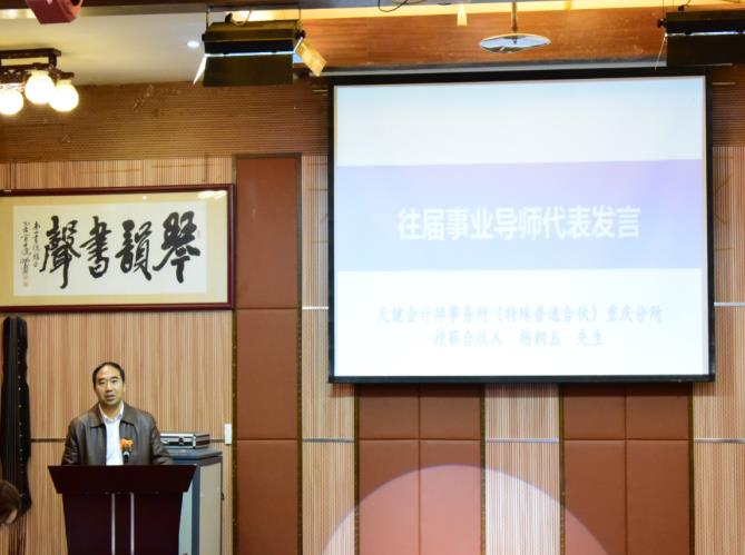 随后,天健会计师事务所(特殊普通合伙)重庆分所授薪合伙人杨朝玉先生作为往届事业导师代表发言。杨朝玉先生回顾自己担任事业导师以来的经历,分享了担任事业导师的经验与心得体会,并感谢ballbet贝博官方网站搭建了产学研的交流平台。