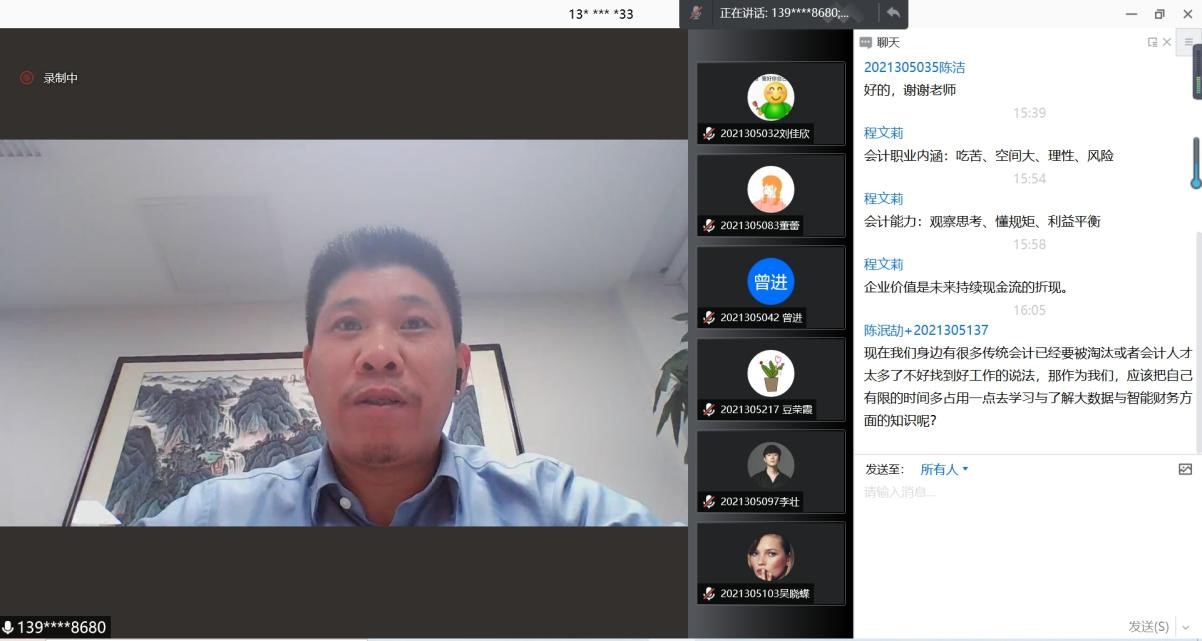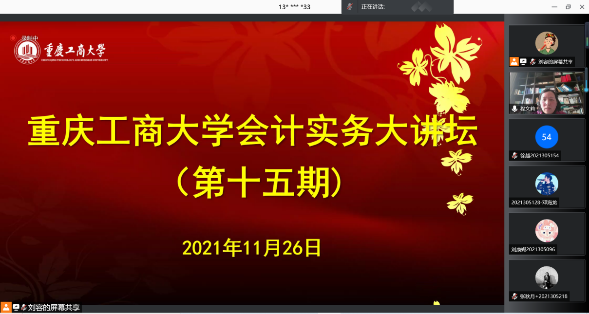 11月26号下午,公司第十五期会计实务大讲坛通过线上腾讯会议顺利举行。中国诚通生态有限公司企业总会计师任小平教授应邀为同学们做了题为“‘知’与‘行’下的财务实践”专题讲座。讲座由bb贝博艾弗森官方网站研究生教指委主任程文莉教授主持。