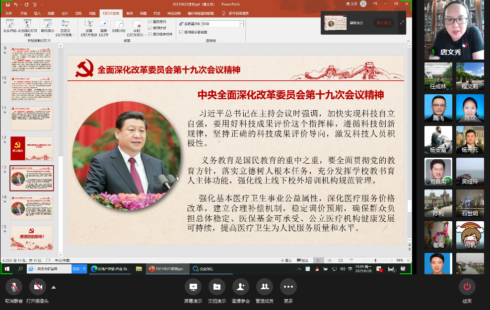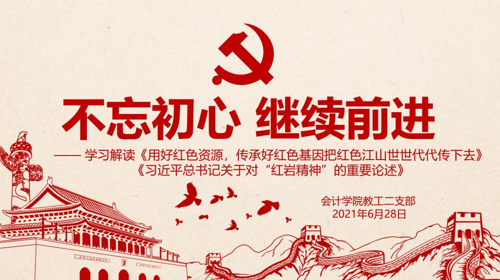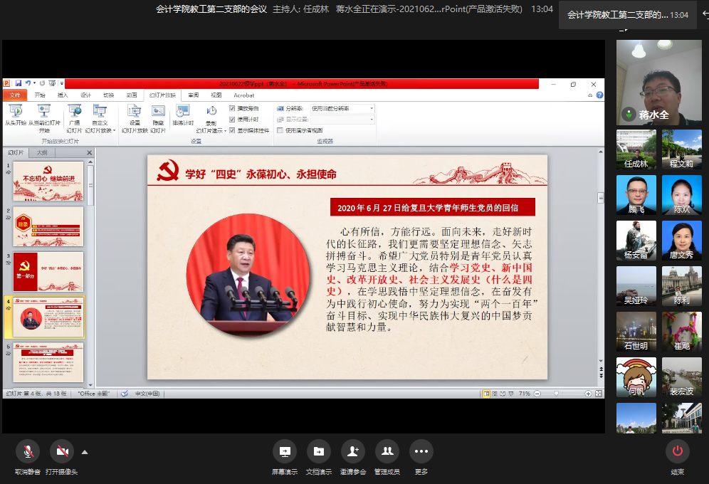 根据学校“四史”教育活动部署要求,6月28日晚,bb贝博艾弗森官方网站教工二支部通过企业微信视频会组织开展了“学好’四史’永葆初心、永担使命”主题党日活动。学习传承党史承载的红色基因和精神谱系,用党的光荣传统和优良作风坚定信念、凝聚力量,推动学院团队队伍高质量发展。bb贝博艾弗森官方网站教工二支部任成林同志主持会议。