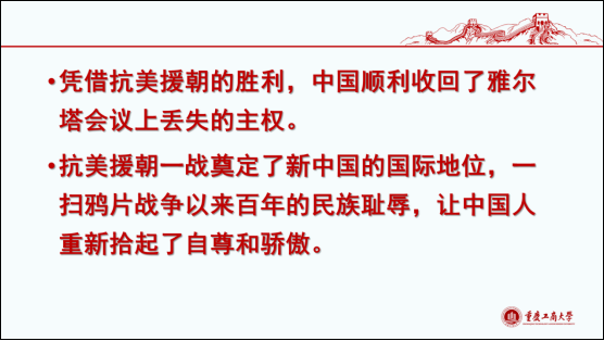 培训会一开始,bb贝博艾弗森官方网站分党委罗惠玉书记以“抗美援朝:不能忘却的伟大胜利” 为主题,带领大家重温了抗美援朝那段历史。罗惠玉书记从1953年的开罗会议、1944年的豫湘桂战役、1945年的雅尔塔会议、1945年中华民国与苏联签订的《中苏友好同盟条约》等历史大事件,分析了中国当时处于的丧权辱国、受西方列强控制的历史背景。到1949年签订中苏新条约后,我国的情况有了一定的改观,但仍未能摆脱独立、真正矗立于世界之林。一直到抗美援朝战争取得了决定性的胜利,打败了以美国为首的16国集团,我国才顺利收回雅尔塔会议丢失的主权,真正在世界格局中战立起来,奠定了新中国的国际地位。罗书记总结了抗美援朝的伟大意义:抗美援朝战争保卫了刚刚诞生的中华人民共和国的安全,打出了新中国的国威军威,极大提高了我国国际地位,增强了中国人民的民族自信心和民族自豪感,为世界和平和人类进步事业作出了巨大贡献。