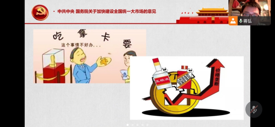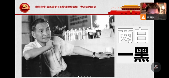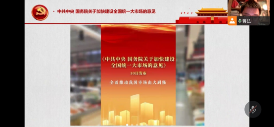 这一次,蒋弘领学了《中共中央 国务院关于加快建设全国统一大市场的意见》。他首先介绍了《意见》出台的指导思想、工作原则、主要目标和重要任务。然后,解读了文件精神。他分析说,建设“全国统一大市场”要解决的最重要问题之一就是进一步降低甚至消除由地方保护和资本垄断产生的交易成本,具体的行动就包括“破除地方保护”和“打击资本垄断”。紧接着,蒋弘通过双汇冷鲜肉、新能源汽车、断头路等案例阐释了分税制改革前后地方保护的形态变化,指出破除地方保护能够极大释放创新动能、提高经济效率。然后,他又讲述了在建国初期,为稳定金融、平抑物价、打击投机而由我党财经第一人陈云坐阵发起的经济领域“淮海战役”。通过故事性地呈现“银元之战”“棉纱之战”“米粮之战”,蒋弘让支部党员体会到了我党在打击资本垄断方面的丰富经验和高超水平。最后,他认为,中国正面临百年未有之大变局,而建立全国统一大市场则是稳中求进、强化内功的关键抓手,是我们自己在大变局之下给自己创造的大机遇。通过建立全国统一大市场,我们将实现一个由14亿人参与的、在960万平方公里陆地和300万平方公里海洋范围内的小型“全球化”,开启中国经济与中国之外的世界经济的“并联”模式。即便中国之外的世界经济出现停滞,或者我们与世界其他部分的联系被外部势力人为打断,中国经济依旧会坚挺,中国会继续稳步往前发展。因此,伴随全国统一大市场的建成,我们将向中华民族伟大复兴的目标更近一步。习总书记曾说过:道阻且长,行则将至,行而不辍,未来可期。相信在党中央的英明领导下、在14亿中国人民的奋发图强下,一个崭新时代将会向我们快步走来,因为水到则渠成。