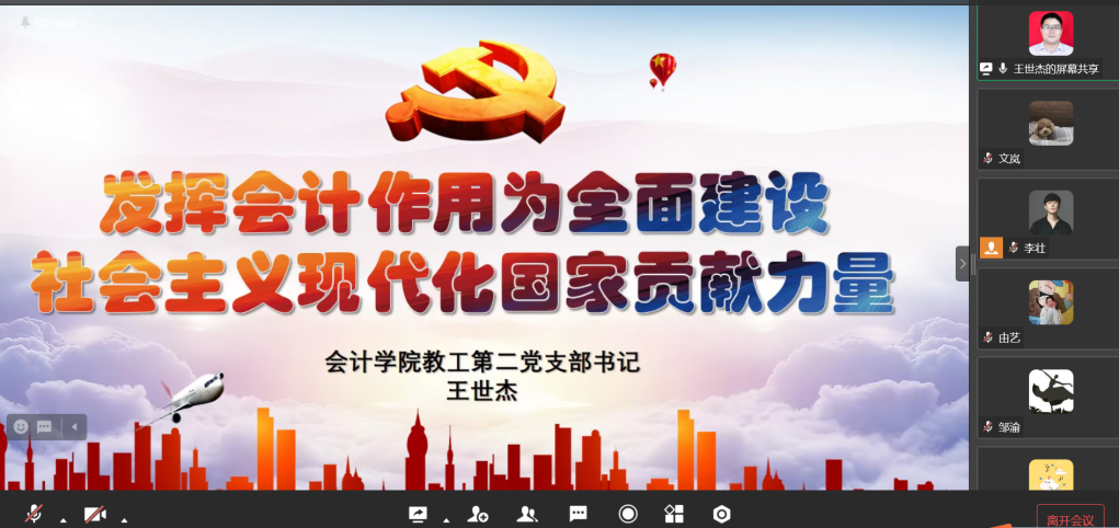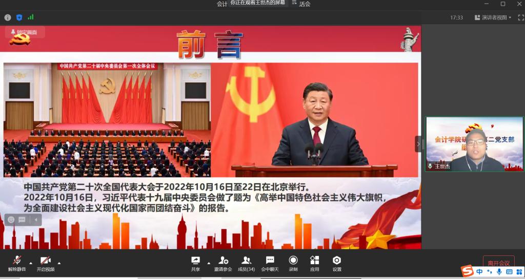 文老师总结称,王老师的党课内容丰富翔实,围绕二十大报告的起草过程,二十大报告内容等方面对会计专硕研究生的学术研究方法和研究方向进行了思考,既是对二十大报告内容及精神的深度解读,更是对会计专硕研究生学术科研的一次专业指导,希望同学们认真研读党的二十大报告,做科研时将个人发展与国家发展结合起来,实现自己的科研突破,服务经济和社会发展。