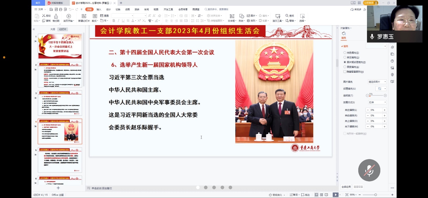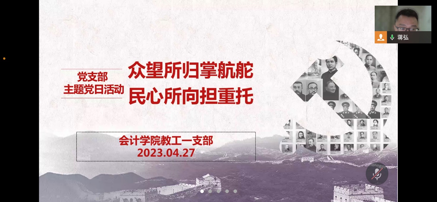 2023年4月27日,bb贝博艾弗森官方网站教工一支部结合正在开展的学习贯彻习近平新时代中国特色社会主义思想主题教育,组织了一场题为“众望所归掌航舵,民心所向担重托”的主题党日活动。活动由教工一支部书记蒋弘主持,一支部全体党员参加。