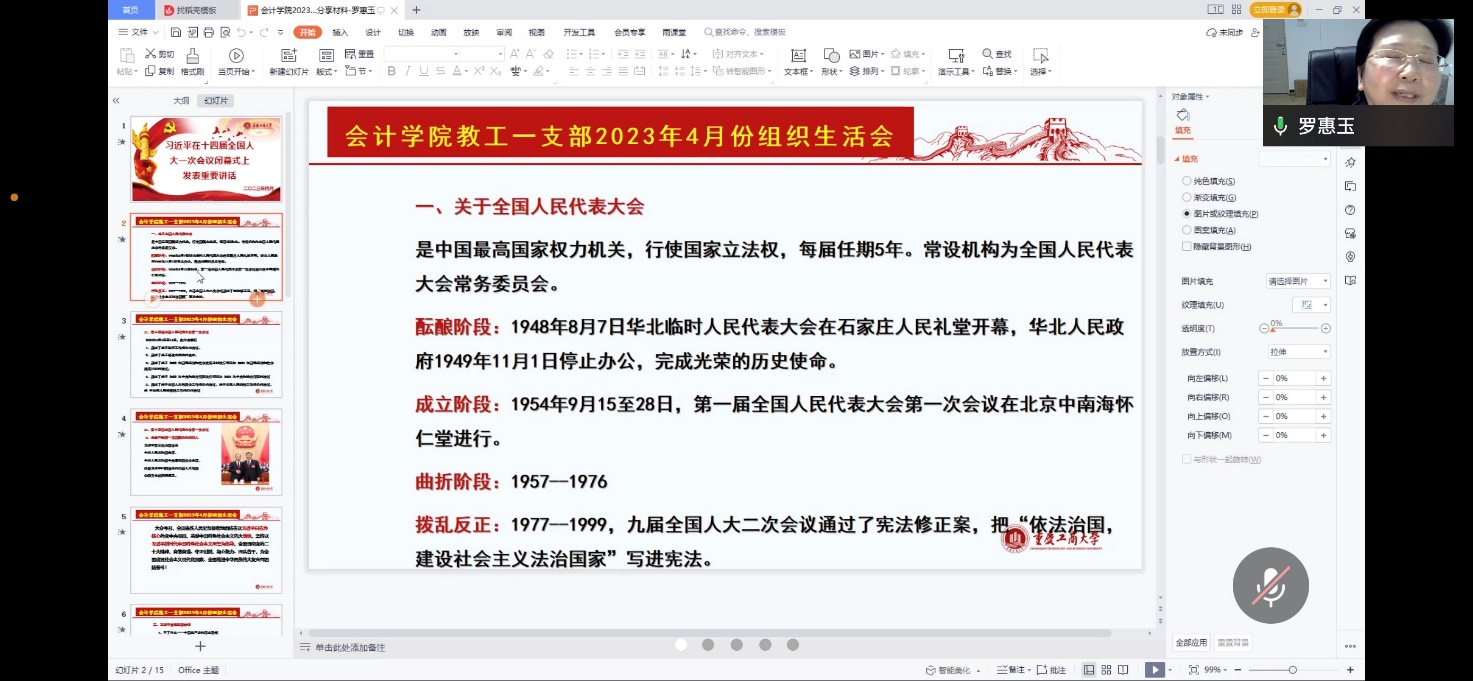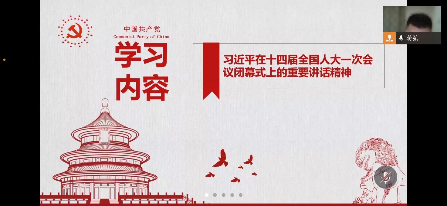 活动一开始,罗惠玉同志带领大家学习了“习近平在十四届全国人大一次会议闭幕式上的重要讲话精神”。她以全国人民代表大会的历史发展作引,讲到第十四届全国人民代表大会第一次会议的内容,然后从“中国共产党的历史贡献”“现阶段的中心任务”“坚定不移推动高质量发展”“始终坚持人民至上”“安全与稳定”“港澳台地区”“和平、发展、合作、共赢”“执政党的自身建设”“只争朝夕,攻坚克难”等九个方面,条理分明地展开对习总书记讲话精神的生动解读。她在领学时强调,全体党员要紧密团结在以习近平同志为核心的党中央周围,坚持以习近平新时代中国特色社会主义思想作为各项工作的指导。