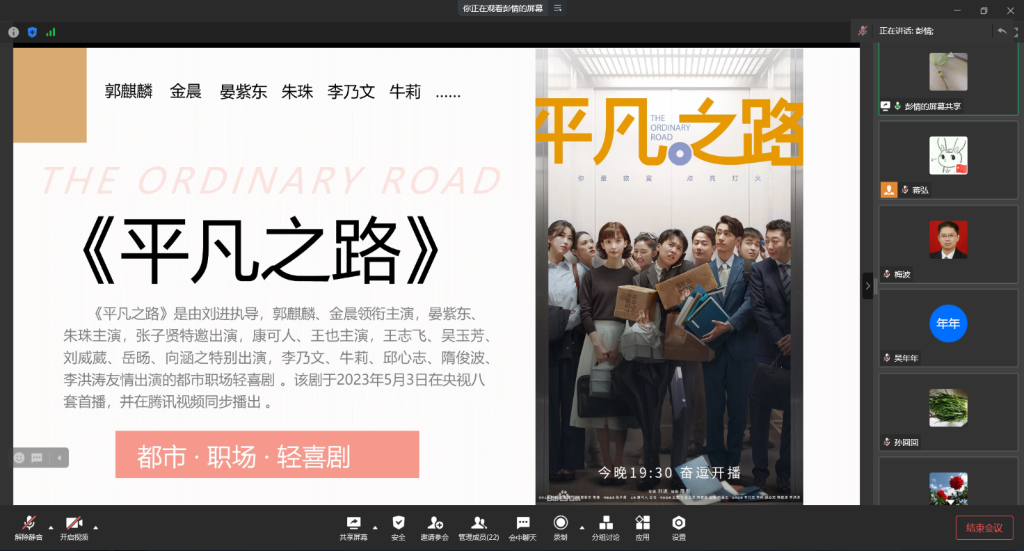 在之后的“好…好…学习”专栏中,彭情同志给大家分享了由央视八套首播的电视剧《平凡之路》。该剧讲述了几位初入职场的打工人,在行业资深前辈的带领下,于职场和生活的路上守望初心,在平凡中创造不凡的故事,是一部以现实为话题,鼓励人们脚踏实地、坚定信念的接地气作品。