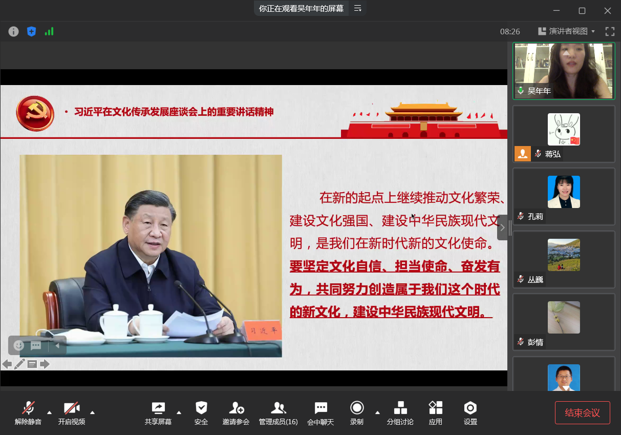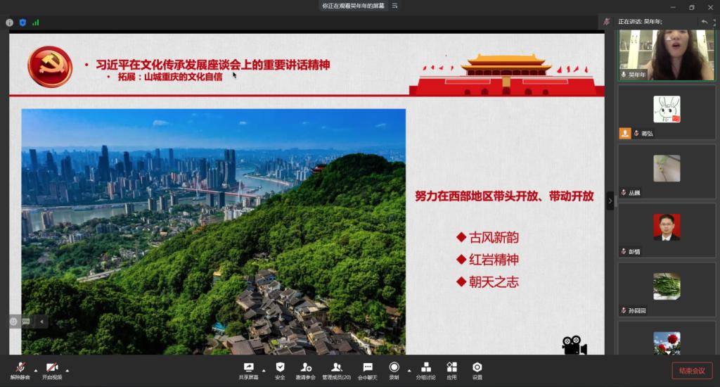 吴年年首先介绍了习近平总书记为开好这次文化传承发展座谈会,专程到中国国家版本馆和中国历史研究院考察调研的情况,并用一个科普视频让大家生动地领略到中国国家版本馆的全貌。座谈会上,习近平总书记指出,文化关乎国本、国运。“如何推进中国特色社会主义文化建设?如何建设中华民族现代文明?”是中国共产党人需要思考的重大命题。吴年年总结提炼了习总书记重要讲话的要点,让大家认识到中华优秀传统文化中的诸多元素共同塑造了中华文明的连续性、创新性、统一性、包容性和和平性,而在五千多年中华文明深厚基础上开辟和发展中国特色社会主义,把马克思主义基本原理同中国具体实际、同中华优秀传统文化相结合是必由之路,是我们取得成功的最大法宝。随后,吴年年引申到大家生活的山城重庆,以多媒体的展现方式让大家了解到重庆全面加强中华优秀传统文化保护传承,守护历史文脉,建设古风新韵交融的城市,传承红色基因,培育为幸福生活奋斗的城市气质,以及弘扬开放精神,打造汇聚全球资源的内陆开放高地等情况。
