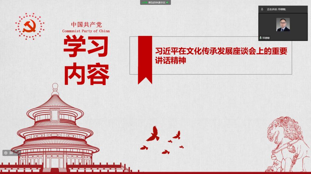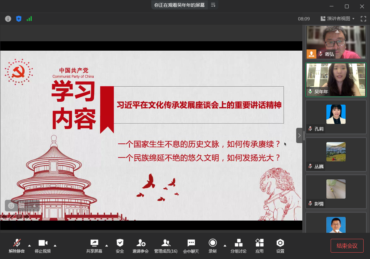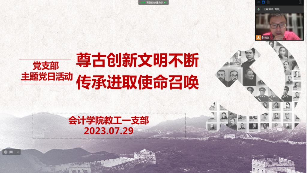 2023年7月29日,教工一支部坚持在暑假开展主题党日活动。本次活动以“尊古创新文明不断,传承进取使命召唤”为主题,由支委会宣传委员吴年年同志领学“习近平在文化传承发展座谈会上的重要讲话精神”。中华文明源远流长,中华文化博大精深,共产党员的使命之一就是要以守正不守旧、尊古不复古的进取和创新精神,传承和发展中华文化,延续世界上唯一没有中断过的中华文明。教工一支部全体党员参加了活动。