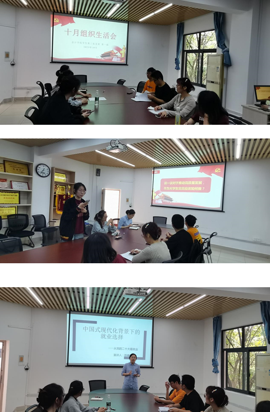 随后,支部书记陈曦老师做了题为“中国式现代化背景下的就业选择”党课讲解,这是支部“党建引领育人”主题工作的重要内容之一。她认为,读懂中国式现代化,我们才能为国家、为民族、为自己找到出路和方向。支部的党员同学都面临就业问题,陈老师认为,无论在行业选择、地域选择、单位选择和职位选择时都要看到中国式现代化的指引,同学们应该将小我融入到大我之中,基于社会和国家的需求去考虑自己的个人追求,成为有理想、敢担当、能吃苦、肯奋斗的青年。作为党员,更应该发挥自身积极性、主动性,在国家需要的地方贡献自己的力量,在遇到困难时勇于发扬吃苦精神。