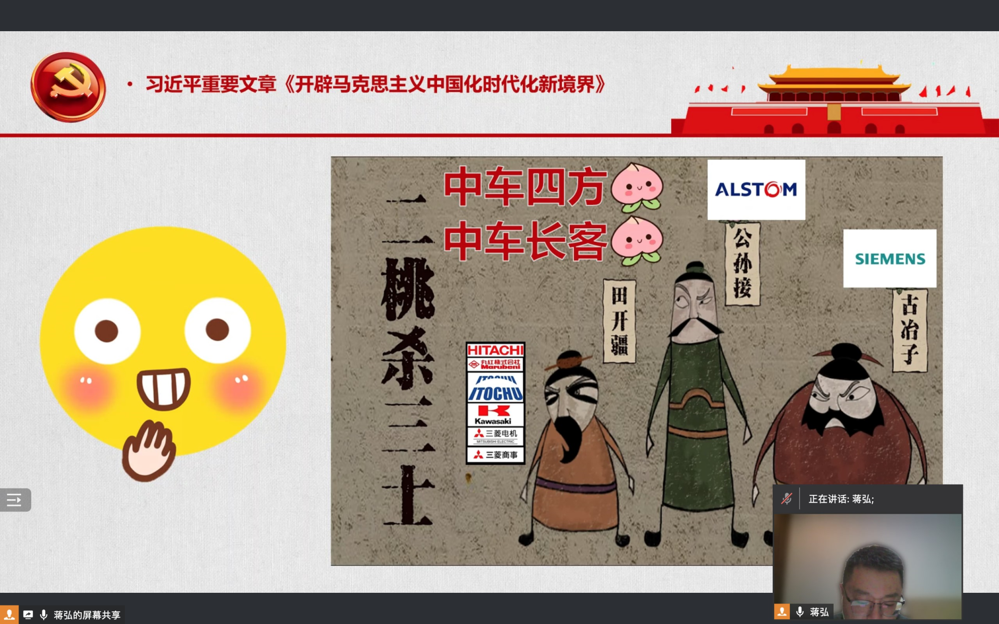 蒋弘围绕这几点要求进行了内容的展开,给大家带来了两堂微党课《高铁的故事》和《意料之外》。在《高铁的故事》中,蒋弘通过介绍高铁的作用和我国高铁谈判“二桃杀三士”著名案例,阐释了将马克思主义基本原理同中华优秀传统文化相结合的实践活动。而在《意料之外》中,蒋弘通过讲述反华组织“大翻译运动”被认为在配合中国官方发动对美国的舆论攻击而被推特封号的事件,阐释了我党“坚持人民至上”的价值理念。蒋弘认为,坚持人民至上,说明我党有敬畏之心。党敬畏人民,才会认真倾听人民的呼声。敬畏人民,就是敬畏真理。