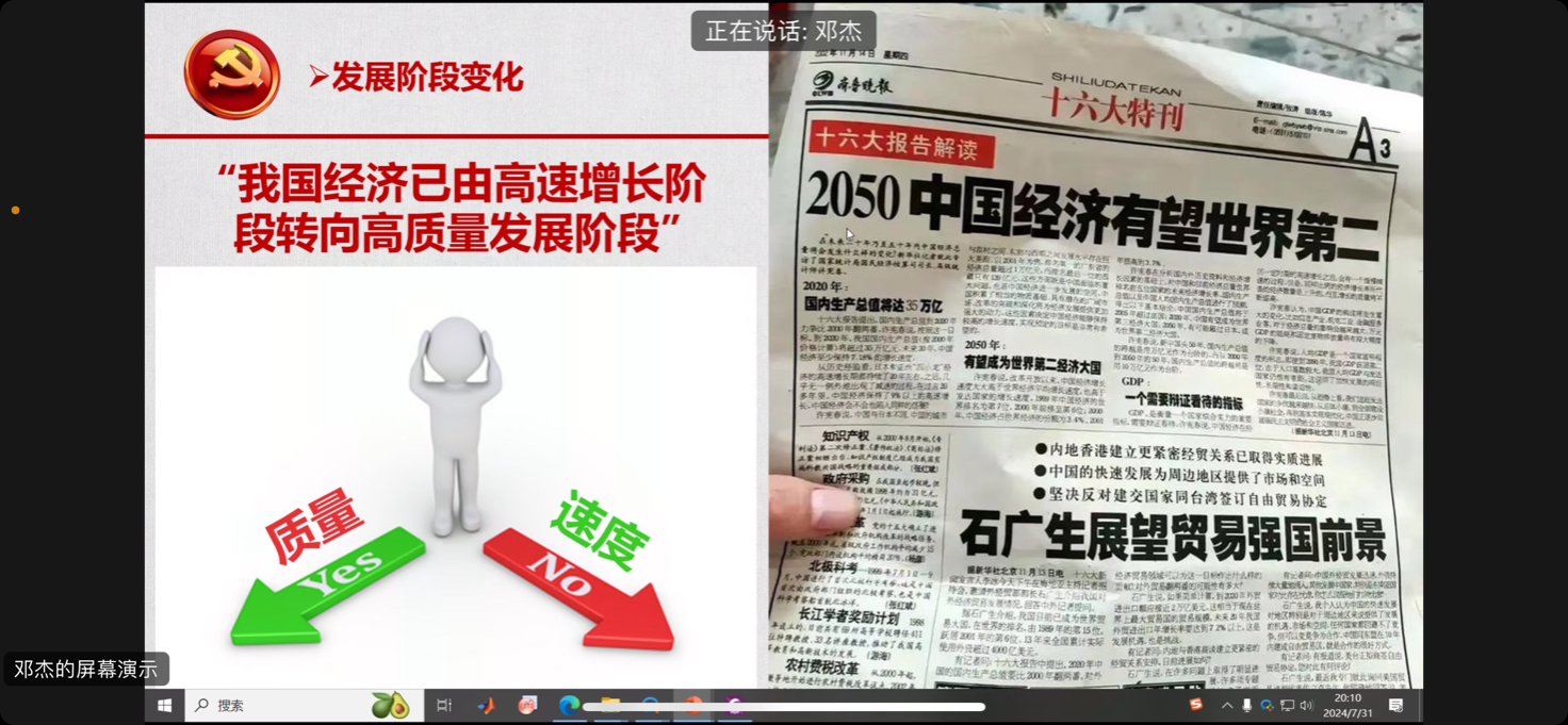 邓杰在领学过程中分析了如何通过科技创新、管理创新和制度创新等新兴要素驱动经济高质量增长,他举例说明了智能建造和自由贸易试验区的相关政策,强调了这些创新措施对提升产业技术水平和优化资源配置的重要性。