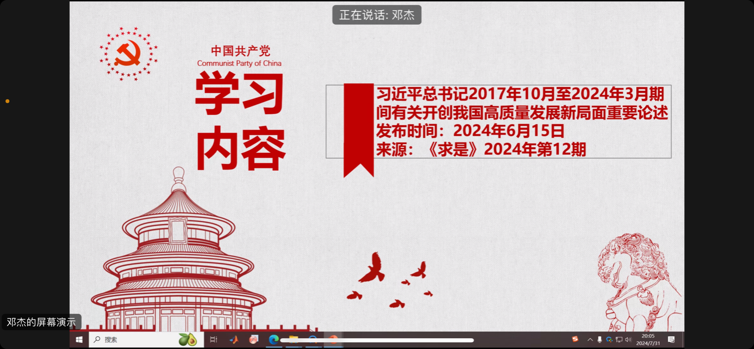 2024年7月31日,bb贝博艾弗森官方网站教工一支部组织开展了题为“质量为先谋新篇,创新驱动促发展”的主题党日活动。活动由纪律委员邓杰同志领学,重点学习了习近平总书记重要文章《开创我国高质量发展新局面》。