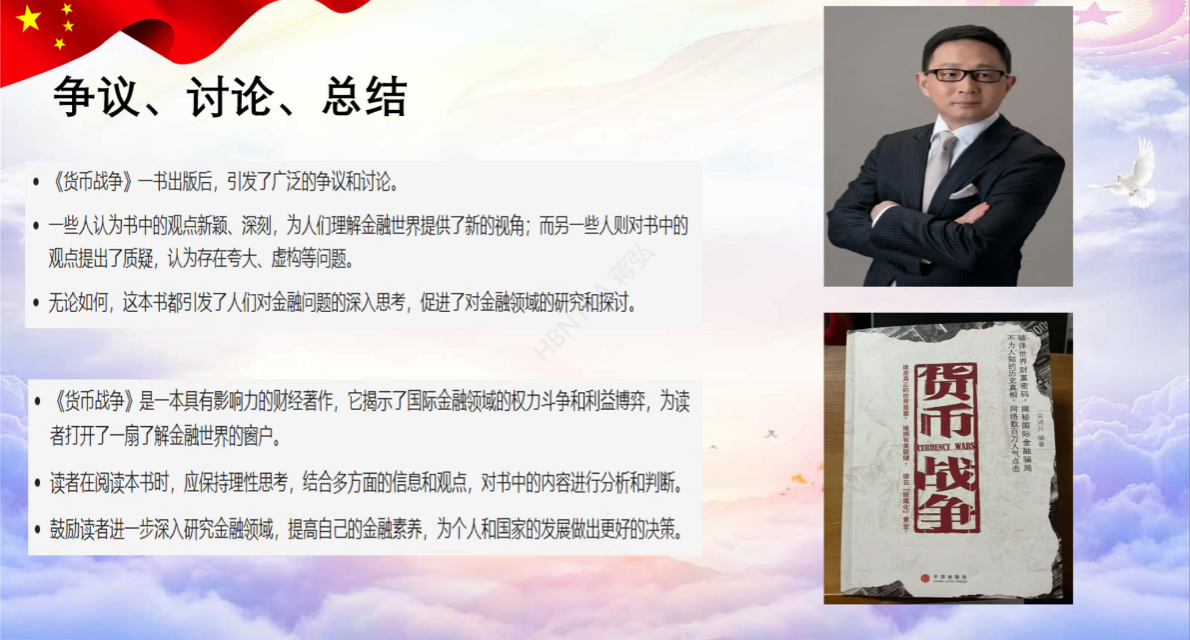 在活动的第三个环节,姜永德在“好...好...学习”专栏分享了一部好书《货币战争》。该书揭示了对金钱的角逐如何主导着西方历史的发展与国家财富的分配,通过再现国际金融资本在政治与经济领域不断掀起金融战役的手段与结果,旨在告诫人们警惕潜在的金融打击,为迎接一场“不流血”的战争做好准备。
