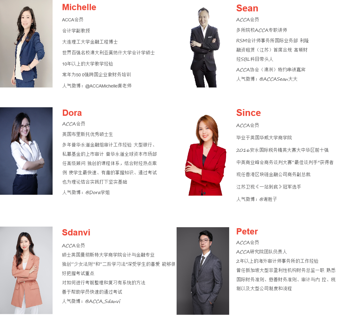 公司为ACCA业余制班配置优势团队团队,邀请国内外高水平ACCA专业讲师、知名学者教授团队来校执教。讲师团队兼具财经理论深度和财经实践广度,重视授课效果及通过水平,所有授课讲师均持有ACCA资质,知名度较高、授课经验丰富。
