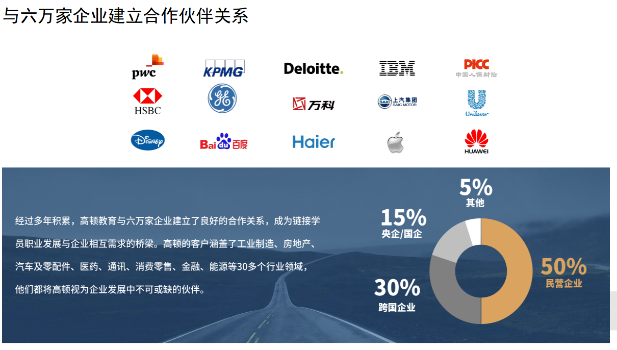 借助高顿教育在全国财经培训领域的强大影响力,建立职业发展中心,提升学员就业率及职位水平。高顿教育现已与国际四大会计师事务所、GE、宝马、大众、阿里巴巴、中国农行、渣打银行等国内外数百所企业建立良好的合作关系,业余制班学员将推荐至优秀企业实习,为毕业求职积累实践经验,优秀学员将有机会毕业后直接签约。