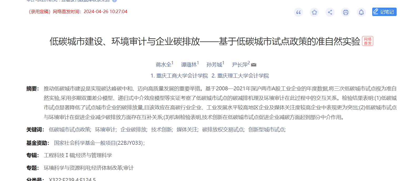 近日,bb贝博艾弗森官方网站蒋水全老师与孙芳城教授合作撰写的论文《低碳城市建设、环境审计与企业碳排放——基于低碳城市试点政策的准自然实验》,正式发表于知名期刊《审计与经济研究》2024年第3期。