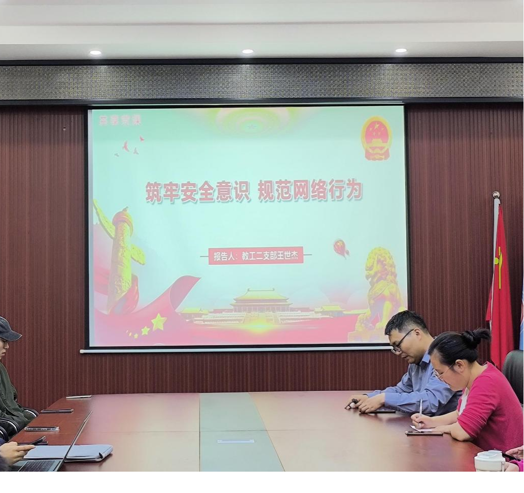 王老师则从总体国家安全观入手,结合全国两会关于网络安全的论述,分析了国家安全和保密工作面临的复杂形势。详细解读了《中国共产党党员网络行为规定》,结合平时工作生活中的案例,为全体党员讲解了国家安全和保密工作的重要性以及泄密带来的危害和严重后果,提出希望党员同志在使用网络时严格规范自身言行,严守国家秘密。